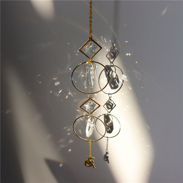 Flawlessly clear prism crystals is strung with sparkling crystals, the same crystal which is used for the chandelier, has a beautiful light-catching effect. Combined with Copper Chains, it is a perfect sun catcher